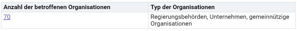 Die folgende Tabelle zeigt die Anzahl und Art der betroffenen Organisationen, die das Ausmaß der Operation verdeutlichen: