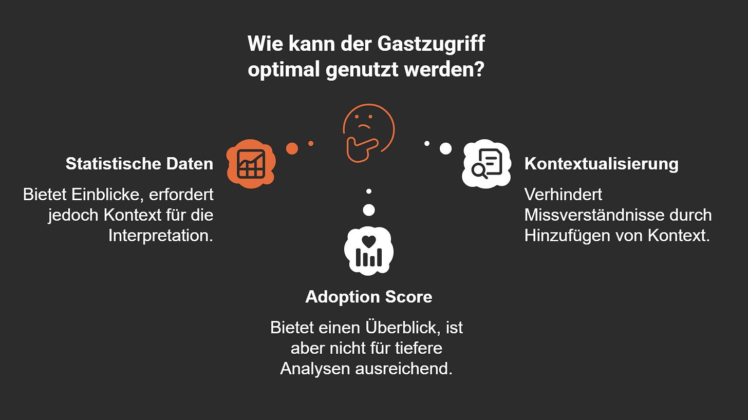 Statistische Daten können dir helfen, die Nutzung des Gastzugriffs zu analysieren. Sie bieten Einblicke in das Verhalten der Benutzer. Beachte jedoch, dass diese Daten immer im Kontext betrachtet werden müssen. Der Adoption Score ist ein hilfreiches Tool, um die Akzeptanz des Gastzugriffs zu bewerten.