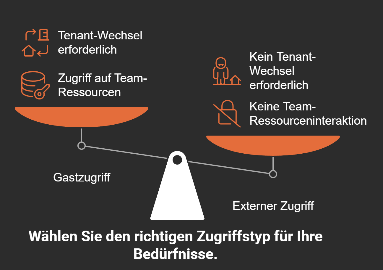 Die Wahl zwischen diesen Optionen hängt von deinen Anforderungen ab. Wenn du möchtest, dass externe Benutzer aktiv an Projekten in ausgewählten Teams teilnehmen, ist Gastzugriff die richtige Wahl.