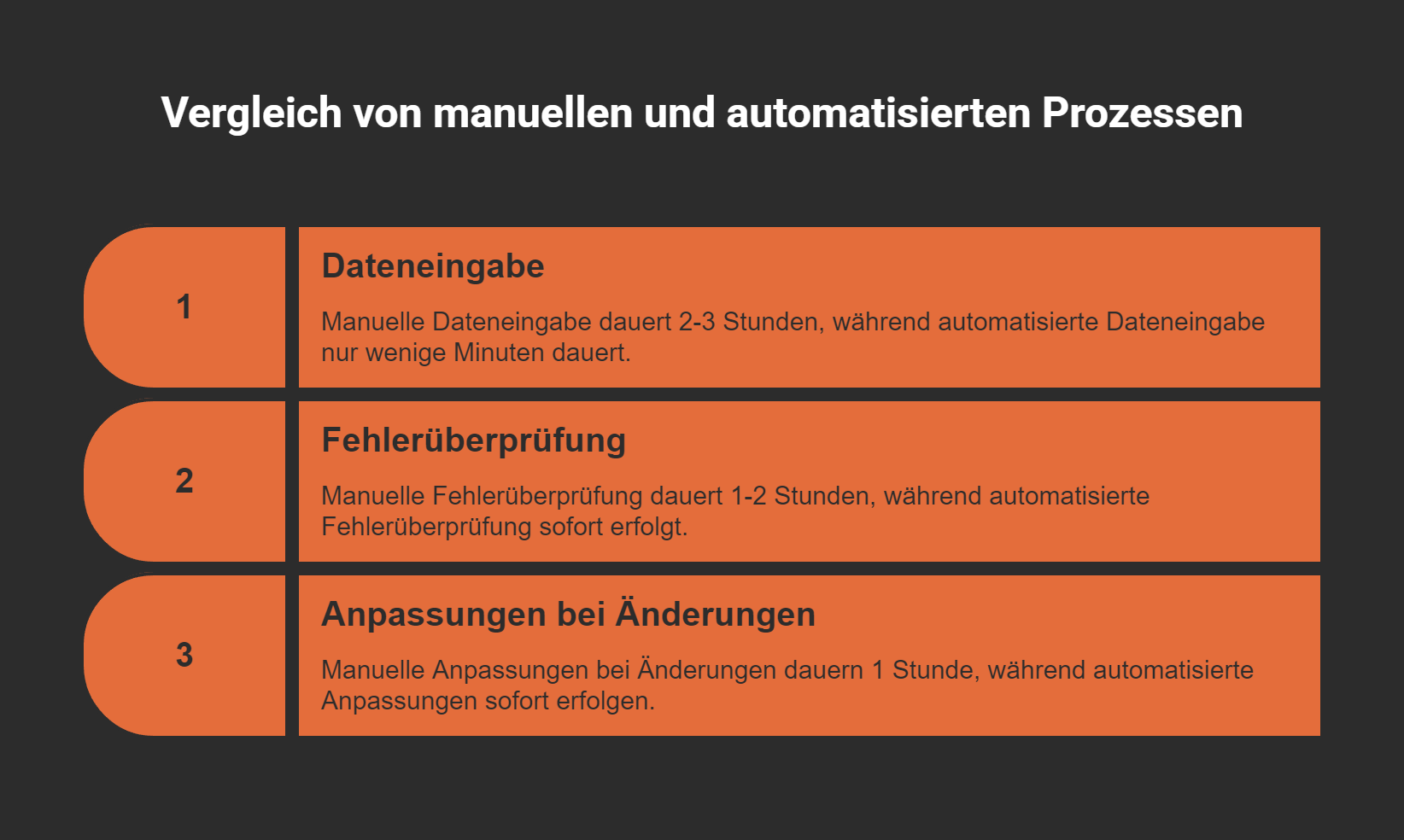 Automatisierung steigert die Effizienz und spart dir wertvolle Zeit. Routineaufgaben wie Dateneingaben oder Fehlerüberprüfungen, die manuell Stunden dauern, lassen sich in wenigen Minuten erledigen. Die folgende Tabelle zeigt, wie Automatisierung den Zeitaufwand reduziert:
