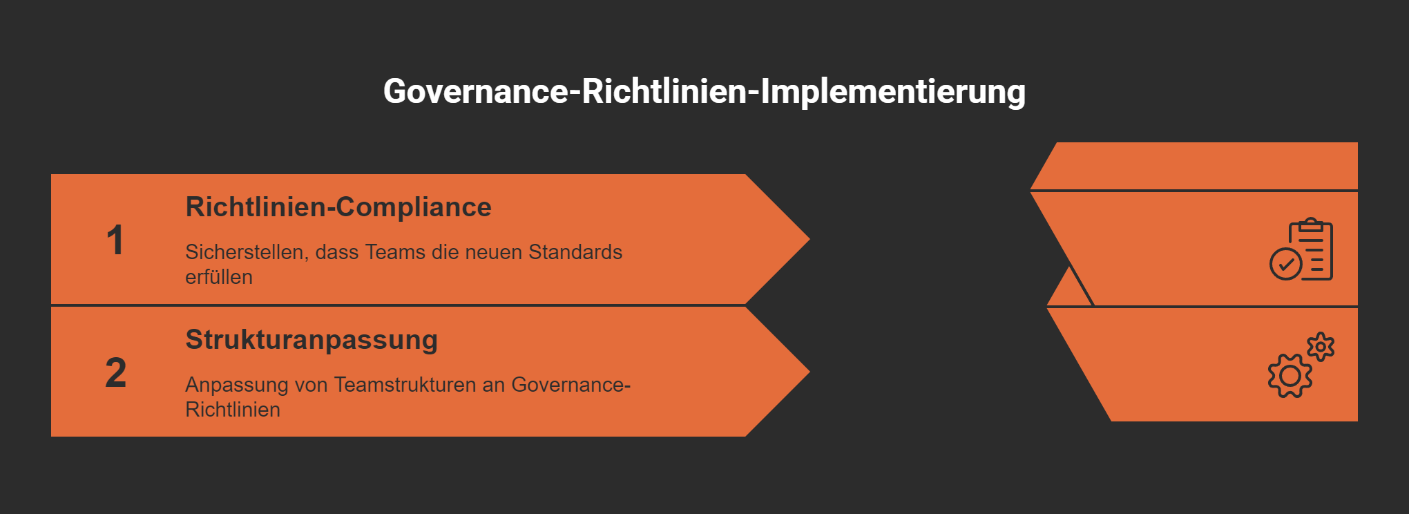 Ordne die analysierten Teams den definierten Governance-Richtlinien zu. Überprüfe, ob die bestehenden Strukturen den neuen Standards entsprechen. Falls nicht, plane notwendige Anpassungen.