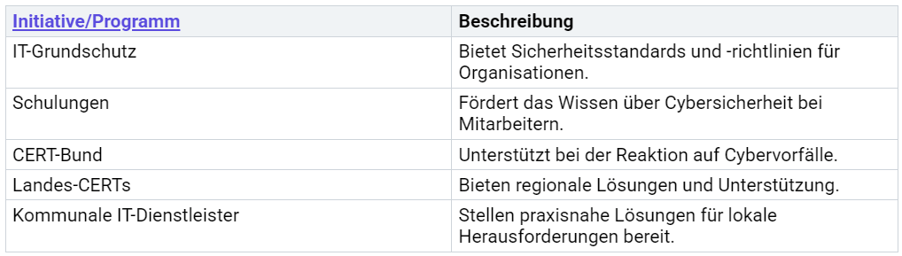 Hinweis: Unternehmen sollten regelmäßig Schulungen durchführen und mit lokalen Behörden zusammenarbeiten, um ihre Sicherheitsmaßnahmen zu verbessern. Die Integration von IT-Grundschutz und Landes-CERTs bietet eine solide Grundlage für den Schutz vor Cyberangriffen.