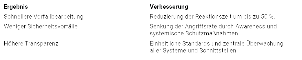 Ein Krankenhausverbund konnte durch die Integration von Sicherheitsmaßnahmen in alle Geschäftsbereiche die Zahl erfolgreicher Angriffe um 40 % senken. Mitarbeitende wurden durch gezielte Awareness-Schulungen auf neue Bedrohungen vorbereitet. Gleichzeitig verbesserte die Einführung eines rollenbasierten Zugriffsmanagements die Kontrolle über sensible Patientendaten.