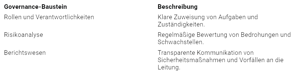 Regelmäßige Überprüfungen: Governance-Mechanismen wie Audits und Risikoanalysen stellen sicher, dass Sicherheitsmaßnahmen wirksam bleiben.