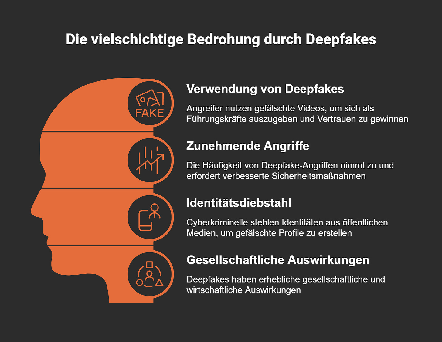 Deepfakes können für Betrug, Identitätsdiebstahl oder Desinformation genutzt werden. Unternehmen riskieren finanzielle Verluste, Rufschädigung und Datenlecks. Besonders gefährlich sind Angriffe wie Business Email Compromise (BEC), bei denen gefälschte Videos oder Audios verwendet werden.