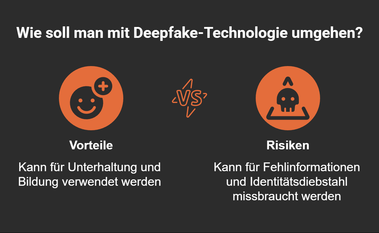 Die Gefahren liegen vor allem in der Wahrnehmung und der immer schwierigeren Unterscheidung zwischen Realität und Fälschung. Sensibilisierung der Öffentlichkeit.
