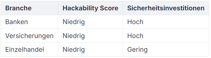 Ein Beispiel: Banken und Versicherungen weisen oft niedrige Hackability Scores auf, da sie hohe Investitionen in Sicherheitsmaßnahmen tätigen. Im Einzelhandel hingegen sind die Investitionen geringer, was zu höheren Risiken führen kann. Die folgende Tabelle zeigt, wie sich der Hackability Score und Sicherheitsinvestitionen branchenübergreifend unterscheiden: