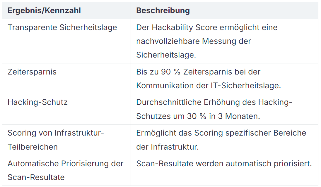Ein Beispiel: Eine veraltete Softwarekomponente wurde als kritische Schwachstelle erkannt. Nach der Behebung sank der Hackability Score des betroffenen Systems deutlich. Dies reduzierte die Angriffsfläche und stärkte die Sicherheitslage.