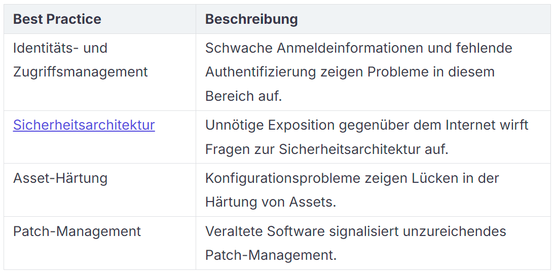 Anzahl und Art der Schwachstellen: Kritische Schwachstellen wie ungesicherte Server oder veraltete Software erhöhen den Score erheblich.