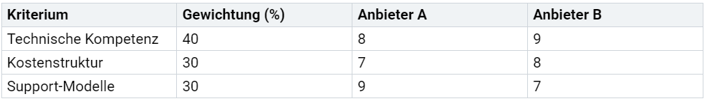 Ein strukturierter Entscheidungsprozess basiert auf klaren Kriterien. Du kannst eine Bewertungsmatrix verwenden, um Anbieter objektiv zu vergleichen. Jede Entscheidung sollte dokumentiert werden, damit sie später nachvollziehbar bleibt.