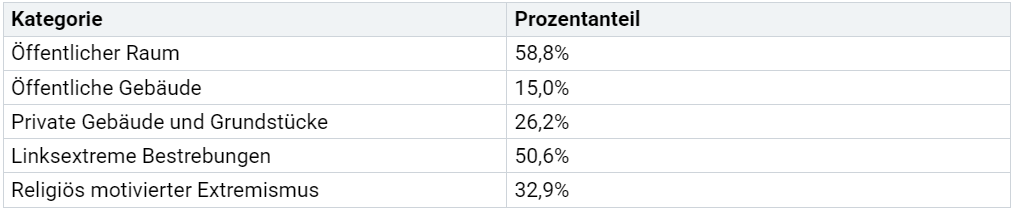 Die Auswirkungen politisch motivierter Angriffe sind in Zahlen deutlich sichtbar. Eine Analyse zeigt, dass 58,8 % der Angriffe auf öffentliche Räume und 15,0 % auf öffentliche Gebäude abzielten. Religiös motivierter Extremismus machte 32,9 % der Fälle aus, während linksextreme Bestrebungen 50,6 % der Angriffe ausmachten. Diese Daten verdeutlichen, wie breit gefächert die Ziele solcher Gruppen sind.