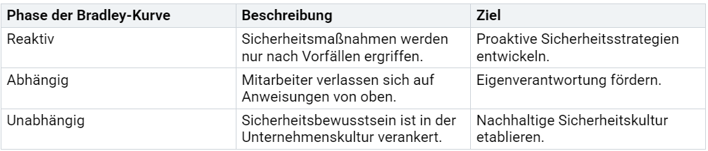 💡 Tipp: Nutze die Bradley-Kurve, um die Sicherheitskultur in deinem Unternehmen gezielt weiterzuentwickeln. Sie hilft dir, den aktuellen Reifegrad zu bewerten und konkrete Maßnahmen zur Verbesserung zu identifizieren.