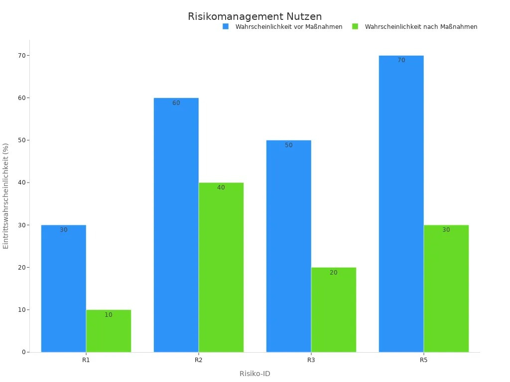 Eine strukturierte Risikobewertung ist der Schlüssel. Du kannst Risiken anhand ihrer Eintrittswahrscheinlichkeit und Schadenshöhe priorisieren. Die folgende Tabelle zeigt, wie präventive Maßnahmen die Eintrittswahrscheinlichkeit und den Risikowert reduzieren: