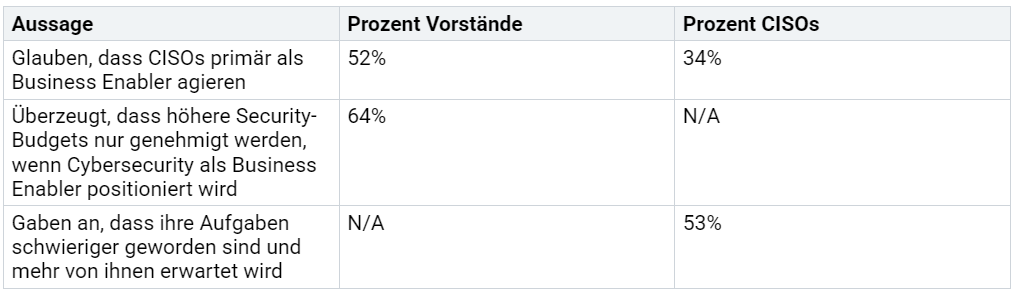 Die Rolle des CISO hat sich gewandelt. Du bist nicht mehr nur für die Sicherheit verantwortlich, sondern sollst auch die Innovationskraft des Unternehmens fördern. Laut einer Umfrage glauben 52 % der Vorstände, dass du primär als Business Enabler agieren solltest. Doch nur 34 % der CISOs teilen diese Ansicht.