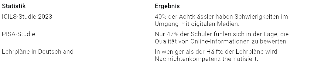 Auch Lehrkräfte stehen vor Herausforderungen. In weniger als der Hälfte der Lehrpläne wird Nachrichtenkompetenz thematisiert. Ohne klare Vorgaben fällt es dir schwer, digitale Inhalte sinnvoll in den Unterricht zu integrieren.