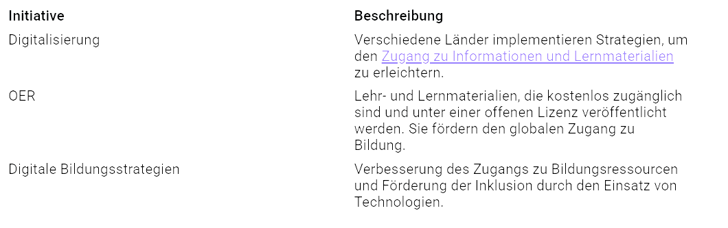 Digitale Technologien eröffnen dir den Zugang zu einer Welt voller Wissen. Du kannst auf Online-Bibliotheken, wissenschaftliche Artikel und Lernvideos zugreifen, die dir helfen, komplexe Themen zu verstehen. Initiativen wie Open Educational Resources (OER) stellen Lehrmaterialien kostenlos zur Verfügung. Diese Materialien sind unter offenen Lizenzen veröffentlicht und fördern den globalen Zugang zu Bildung.
