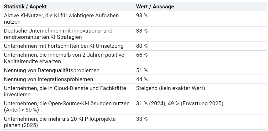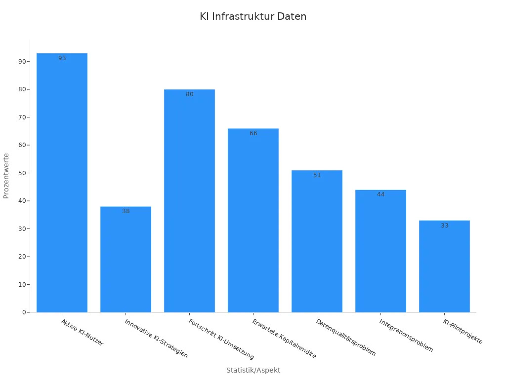 Eine leistungsfähige Infrastruktur ist die Basis für erfolgreiche KI-Projekte. Sie umfasst moderne IT-Systeme, Cloud-Dienste, Datenplattformen und sichere Netzwerke. 93 % der aktiven KI-Nutzer berichten, dass sie durch Künstliche Intelligenz mehr Zeit für wichtige Aufgaben gewinnen. Unternehmen investieren verstärkt in Cloud-Lösungen und qualifizierte Fachkräfte, um die Umsetzung zu beschleunigen. Ein Einzelhändler konnte durch KI-gestützte Bestandsoptimierung seine Lagerkosten um 23 % senken. Die folgende Tabelle zeigt zentrale Kennzahlen zur Infrastruktur und Nutzung von KI in deutschen Unternehmen: