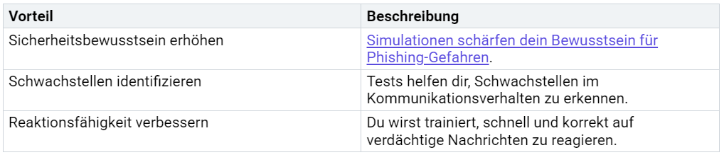 Durch diese Übungen stärkst du deine Wachsamkeit und trägst aktiv zur Sicherheitskultur deines Unternehmens bei. Die Kombination aus Schulungen und Simulationen macht dich fit für den Umgang mit aktuellen Bedrohungen.