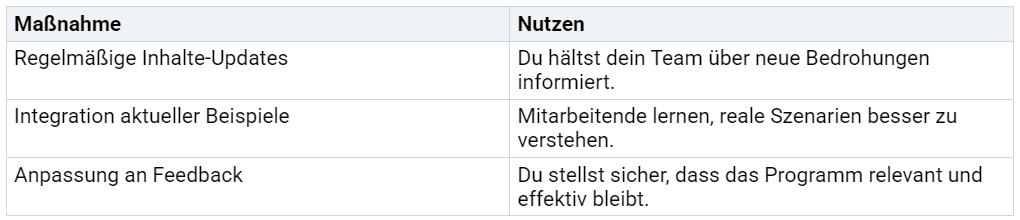 Du solltest dein Programm mindestens einmal jährlich aktualisieren. Neue Bedrohungen und Technologien erfordern regelmäßige Anpassungen. Feedback von Mitarbeitenden hilft dir, die Inhalte gezielt zu verbessern.