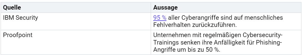 Menschliche Fehler bleiben der entscheidende Faktor, der Angreifern Türen öffnet. In 74 Prozent der Fälle werden Schwächen wie Bedienfehler oder Social Engineering ausgenutzt. Ein Cyber-Security-Awareness Programm ist unverzichtbar, um Mitarbeitende zu sensibilisieren und die Sicherheit Ihres Unternehmens nachhaltig zu erhöhen.