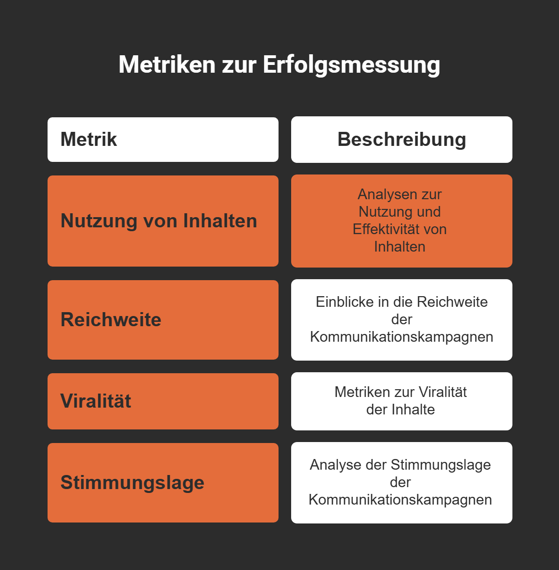 Diese Metriken ermöglichen dir, die Wirkung deiner Botschaften zu bewerten und gezielte Verbesserungen vorzunehmen. Du kannst beispielsweise erkennen, welche Inhalte besonders gut ankommen und welche Bereiche noch Optimierungspotenzial haben.