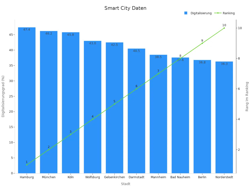 Intelligente Infrastrukturen bilden das Rückgrat moderner Städte. Sensoren und vernetzte Systeme erfassen Daten in Echtzeit. Sie steuern die Straßenbeleuchtung, überwachen den Energieverbrauch und melden Störungen automatisch. Öffentliche Gebäude profitieren von digitalen Steuerungen. Diese Systeme senken den Energieverbrauch um bis zu 20 Prozent. Bis 2030 lässt sich die Effizienz sogar verdoppeln. Intelligente Beleuchtungssysteme sparen bis zu 85 Prozent Energie ein. Die eco-Studie „Der Smart-City-Markt in Deutschland 2021-2026“ hebt hervor, dass viele Projekte noch keine festen Ziele formulieren. Eine kontinuierliche Überprüfung bleibt daher wichtig, um die tatsächlichen Umwelteffekte zu messen.