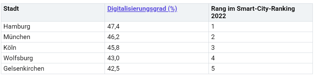 Digitale Technologien bilden das Rückgrat einer modernen Stadt. Informations- und Kommunikationstechnologien (IKT) vernetzen Menschen, Geräte und Infrastrukturen. Sensoren messen den Energieverbrauch, steuern die Straßenbeleuchtung oder regeln den Verkehr. In Hamburg und München verbessern intelligente Mobilitätsstationen und smarte Straßenbeleuchtung die Sicherheit und Effizienz. Digitale Verwaltungsprozesse und Online-Beteiligung fördern die Transparenz und erleichtern den Zugang zu städtischen Dienstleistungen. Der Smart City Index bewertet weltweit 142 Städte nach technologischem Fortschritt, Innovation und Lebensqualität. Städte wie Zürich, Oslo und Canberra führen die Rangliste an.