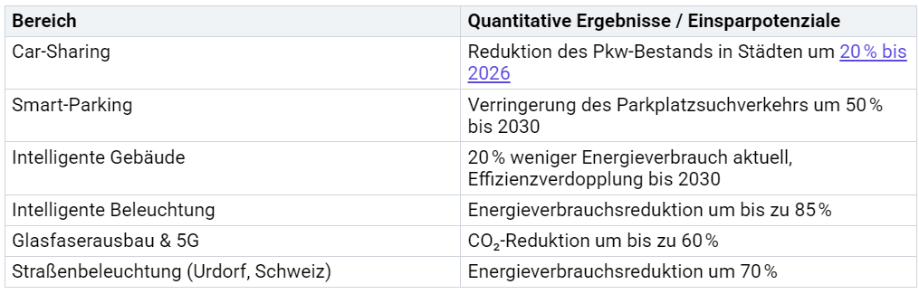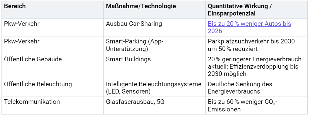 Du profitierst auch wirtschaftlich von nachhaltigen Lösungen. Effiziente Gebäude, intelligente Beleuchtung und digitale Technologien sparen Energie und Kosten. Die folgende Tabelle zeigt dir, wie groß die Einsparpotenziale sind: