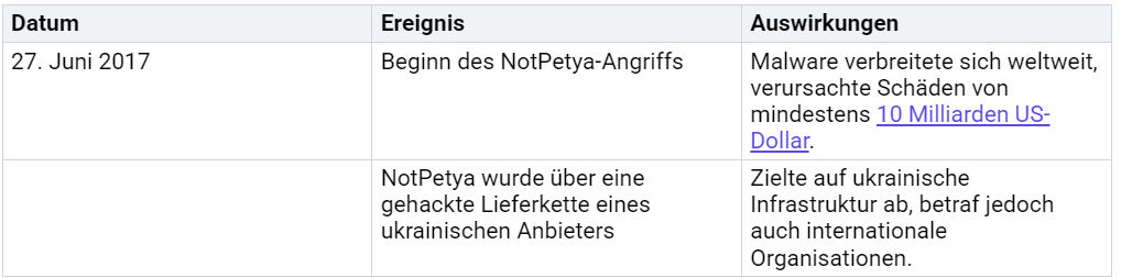 Am 27. Juni 2017 begann der Angriff. NotPetya verbreitete sich zunächst in der Ukraine, griff jedoch schnell auf andere Länder über. Internationale Unternehmen wie Maersk und Merck wurden schwer getroffen. Die Malware verursachte Schäden in Milliardenhöhe. Die folgende Tabelle zeigt wichtige Ereignisse und ihre Auswirkungen: