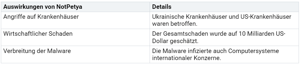 Diese Beispiele zeigen, wie ein Cyberangriff nicht nur wirtschaftliche, sondern auch soziale und humanitäre Folgen haben kann.