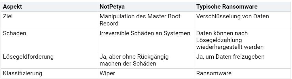 NotPetya zerstört Daten unwiderruflich, während herkömmliche Ransomware Daten verschlüsselt und Lösegeld fordert. Selbst bei Zahlung des Lösegelds bleiben die Daten bei NotPetya unzugänglich. Es handelt sich daher um einen sogenannten Wiper, der auf maximale Zerstörung abzielt.