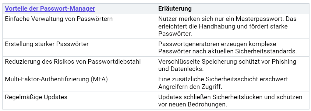 Viele Menschen profitieren im Alltag von Passwort-Managern. Sie sparen Zeit, weil sie sich nur ein einziges Masterpasswort merken müssen. Die Software übernimmt das Erstellen und Speichern sicherer Passwörter für jede Website. Nutzer vermeiden dadurch die Wiederverwendung von Passwörtern und erhöhen die Sicherheit ihrer Konten.