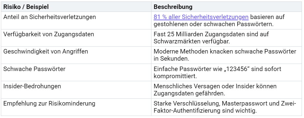 Trotz vieler Vorteile gibt es auch Risiken. Das größte Risiko besteht im Verlust oder Diebstahl des Masterpassworts. Wer dieses Passwort vergisst oder es an Dritte weitergibt, verliert den Zugang zu allen gespeicherten Daten. Passwort-Manager speichern alle Zugangsdaten zentral. Ein erfolgreicher Angriff auf diese zentrale Stelle kann schwerwiegende Folgen haben.