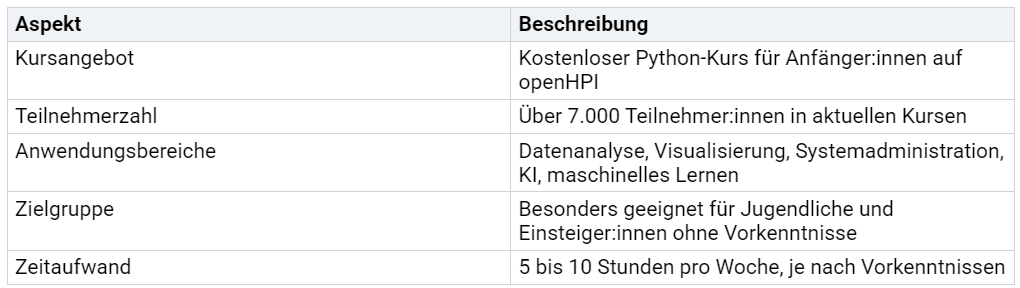 Du möchtest Cybersicherheit verbessern? Python bietet dir dafür ein leicht verständliches und flexibles Werkzeug. Viele Jugendliche und Einsteiger:innen nutzen Python bereits, weil du keine Vorkenntnisse brauchst. Ein kostenloser Python-Kurs auf openHPI zeigt: Über 7.000 Teilnehmer:innen lernen damit die Grundlagen in kurzer Zeit. Die Sprache eignet sich für Datenanalyse, Visualisierung, Systemadministration und maschinelles Lernen. Die folgende Tabelle gibt dir einen schnellen Überblick über die wichtigsten Fakten: