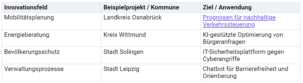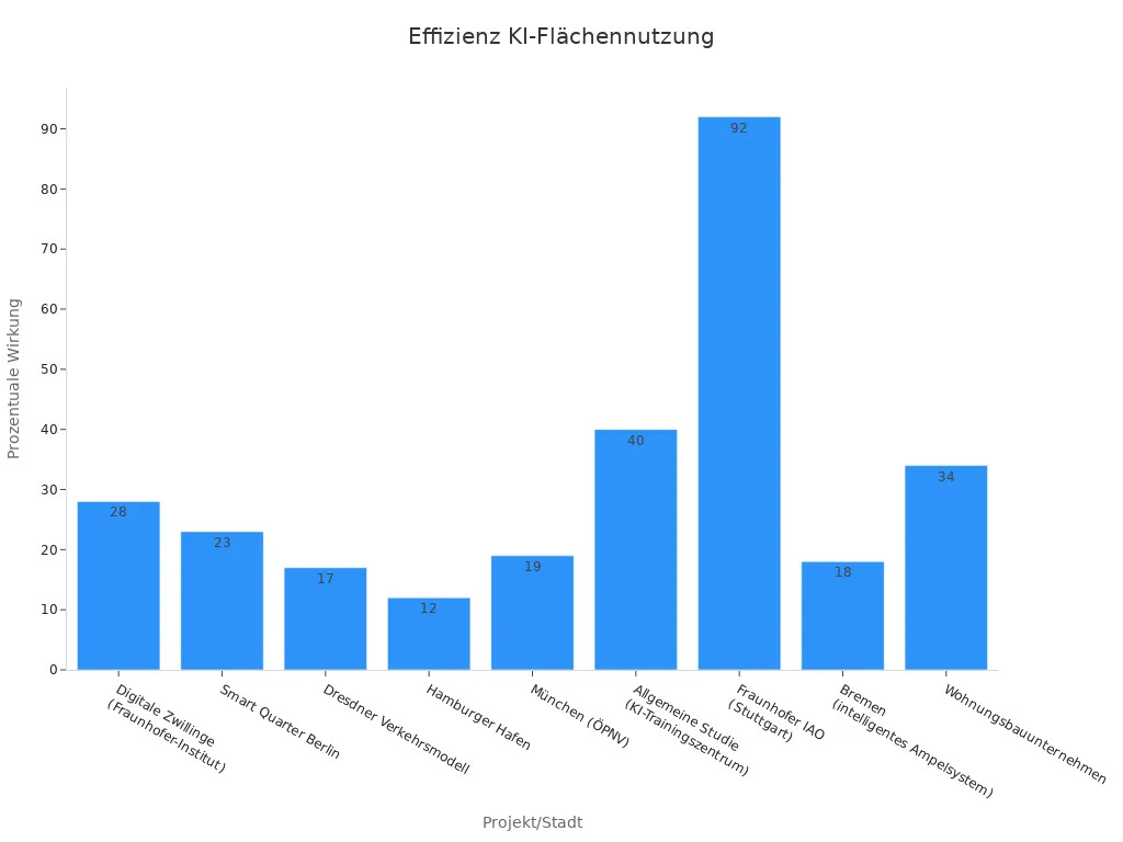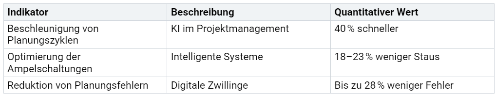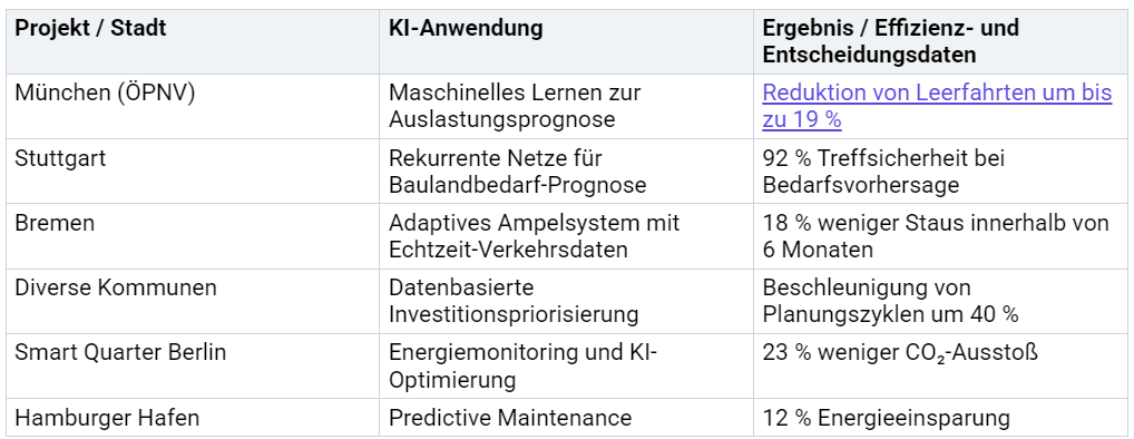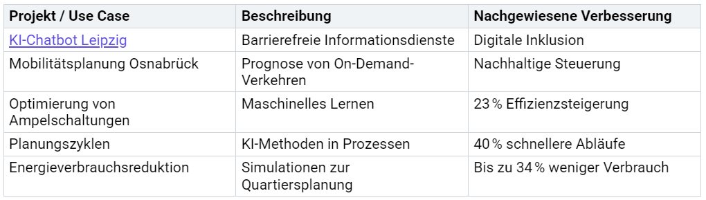 Die folgende Tabelle zeigt, wie verschiedene Städte und Projekte durch KI messbare Verbesserungen erzielen: