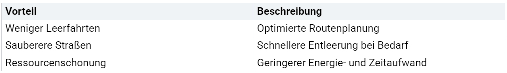 Städte profitieren von saubereren Straßen und geringeren Kosten. Die Lebensqualität steigt, weil Müllbehälter seltener überfüllt sind. Nachhaltige Stadtentwicklung wird so zur Realität.