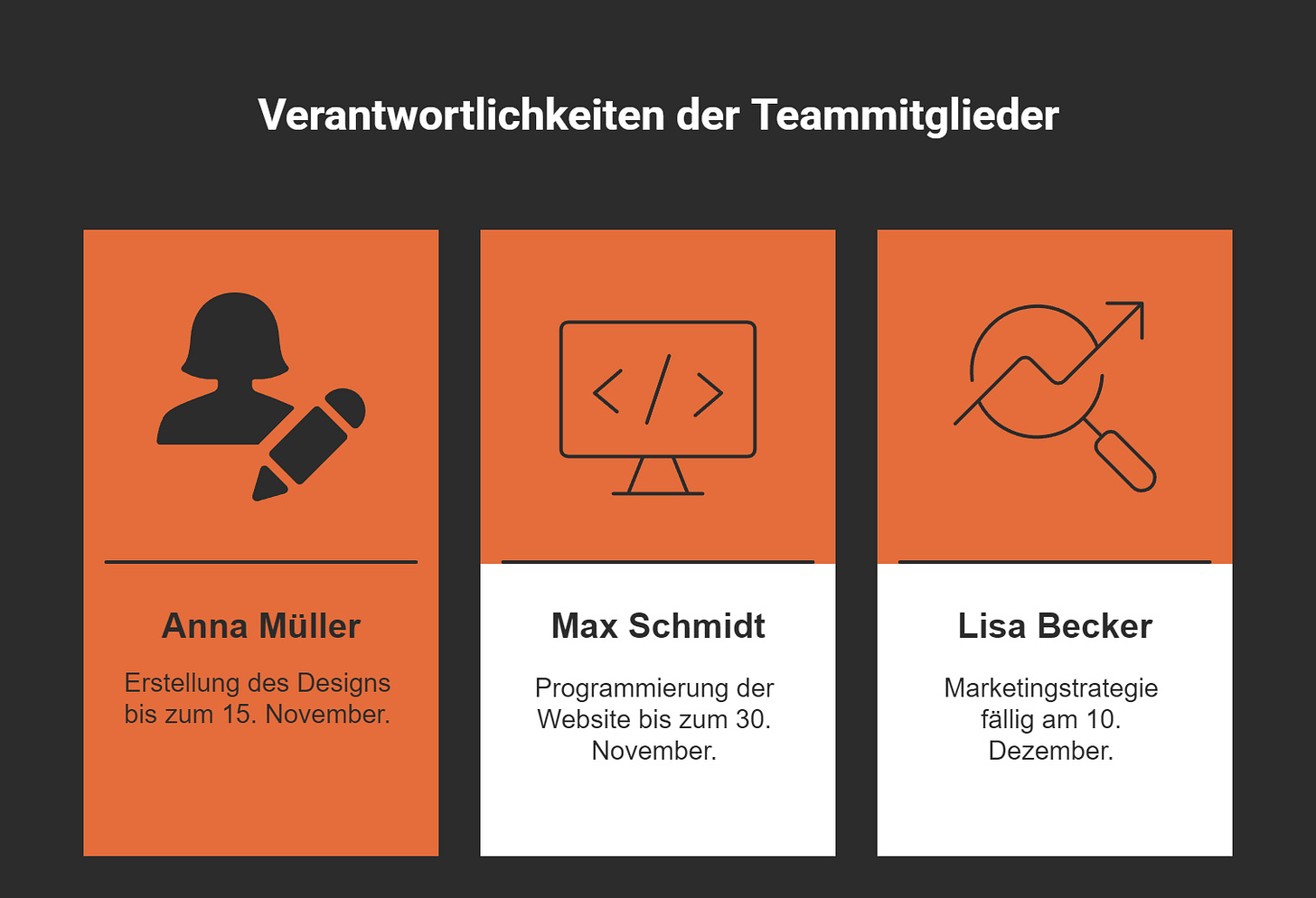 Erstelle eine Liste mit allen Teammitgliedern und ihren jeweiligen Aufgaben. Ein Beispiel könnte so aussehen: