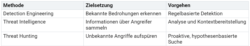 Threat Hunting unterscheidet sich deutlich von klassischen, reaktiven Sicherheitsmaßnahmen. Während Detection Engineering darauf abzielt, bekannte Bedrohungen durch fest definierte Regeln und Signaturen zu erkennen, sucht Threat Hunting gezielt nach unbekannten oder fortgeschrittenen Angriffen, die herkömmliche Systeme übersehen könnten. Detection Engineering arbeitet mit festen Detektionsregeln, die auf bereits identifizierten Mustern basieren. Threat Intelligence liefert Informationen über aktuelle Bedrohungen und Angreifer, die für die Bewertung des eigenen Risikoprofils genutzt werden.