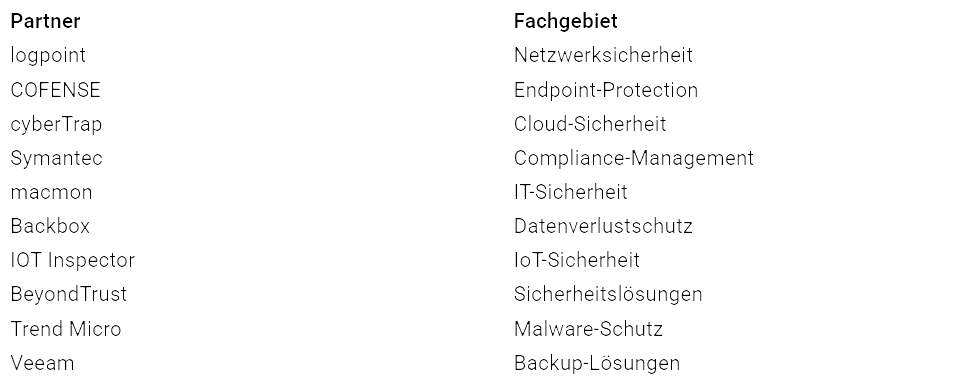 Eine Vielzahl von Partnern bietet spezialisierte Lösungen für unterschiedliche Bereiche der Cyber Security. Die folgende Tabelle zeigt einige Beispiele: