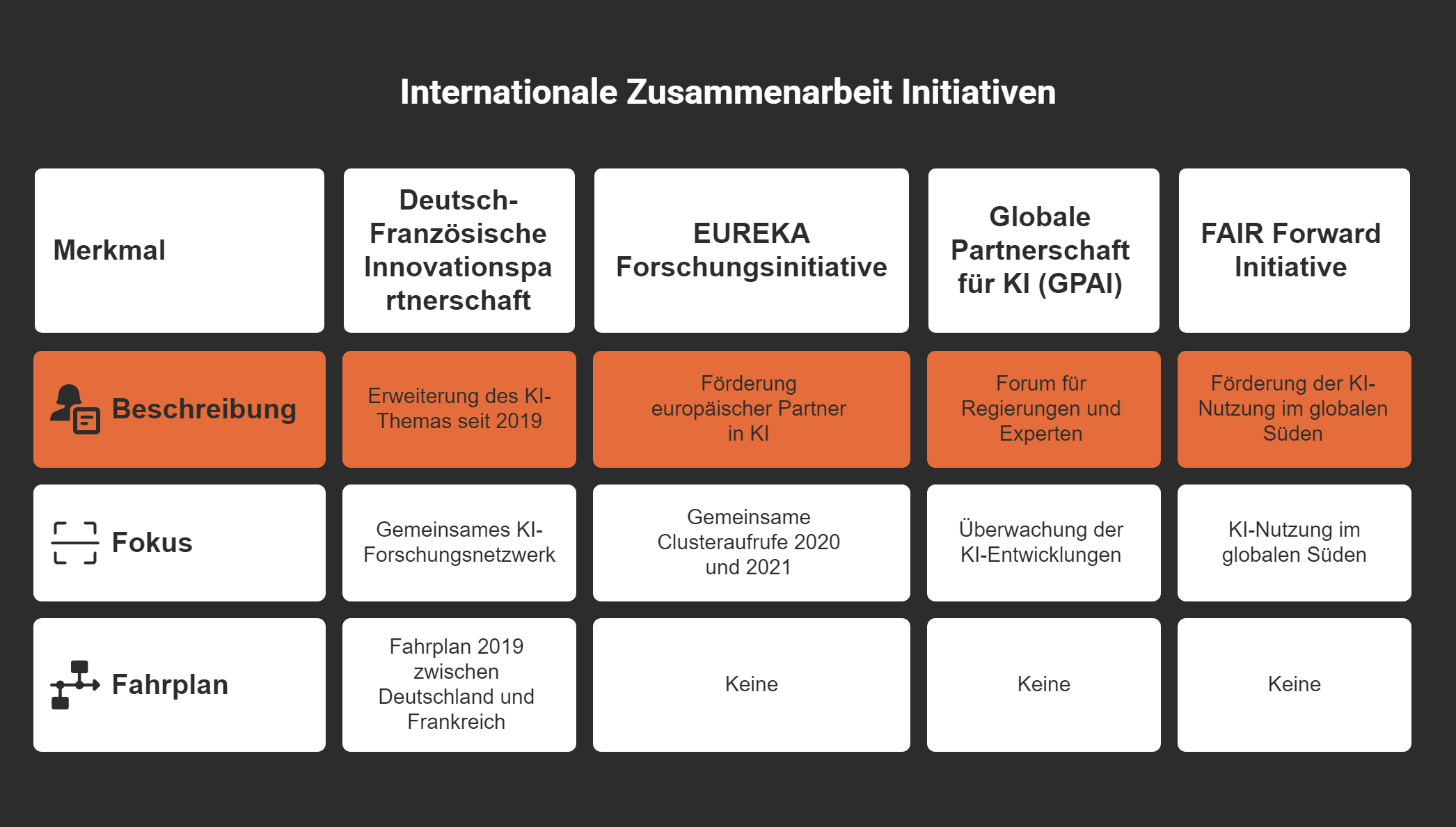 Zum Beispiel haben Deutschland und Frankreich 2019 eine Innovationspartnerschaft erweitert, die sich auf KI konzentriert. Auch die Global Partnership on AI (GPAI) bringt Regierungen und Expert:innen zusammen, um die Entwicklung von KI zu beobachten und zu steuern. Solche Projekte fördern nicht nur den Austausch von Wissen, sondern auch die Entwicklung gemeinsamer Standards.