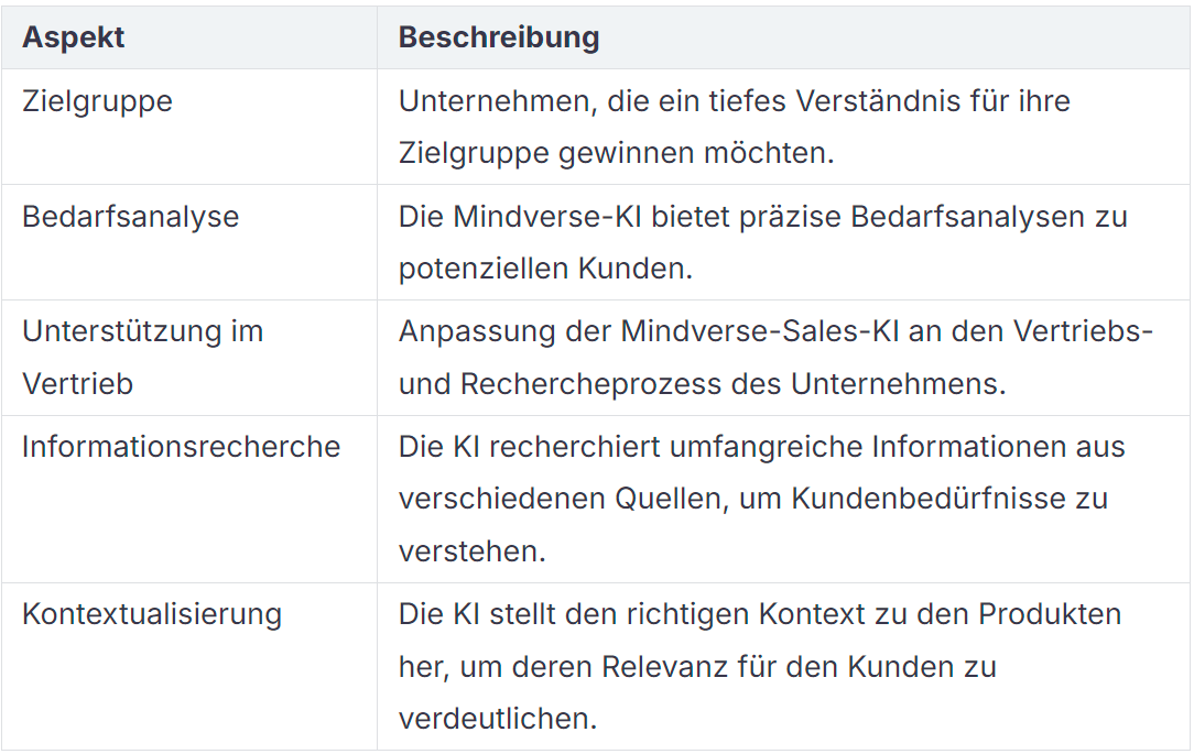 Eine Fallstudie zeigt, wie Unternehmen durch gezielte Bedarfsanalysen ihre Zielgruppe besser verstehen können. Die Mindverse-KI unterstützt dabei, indem sie umfangreiche Informationen recherchiert und den Kontext zu den Produkten herstellt. Hier eine Übersicht: