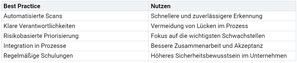 💡 Tipp: Unternehmen sollten Schwachstellenmanagement als festen Bestandteil ihrer IT-Strategie etablieren. Kontinuierliche Verbesserung sichert langfristigen Erfolg.