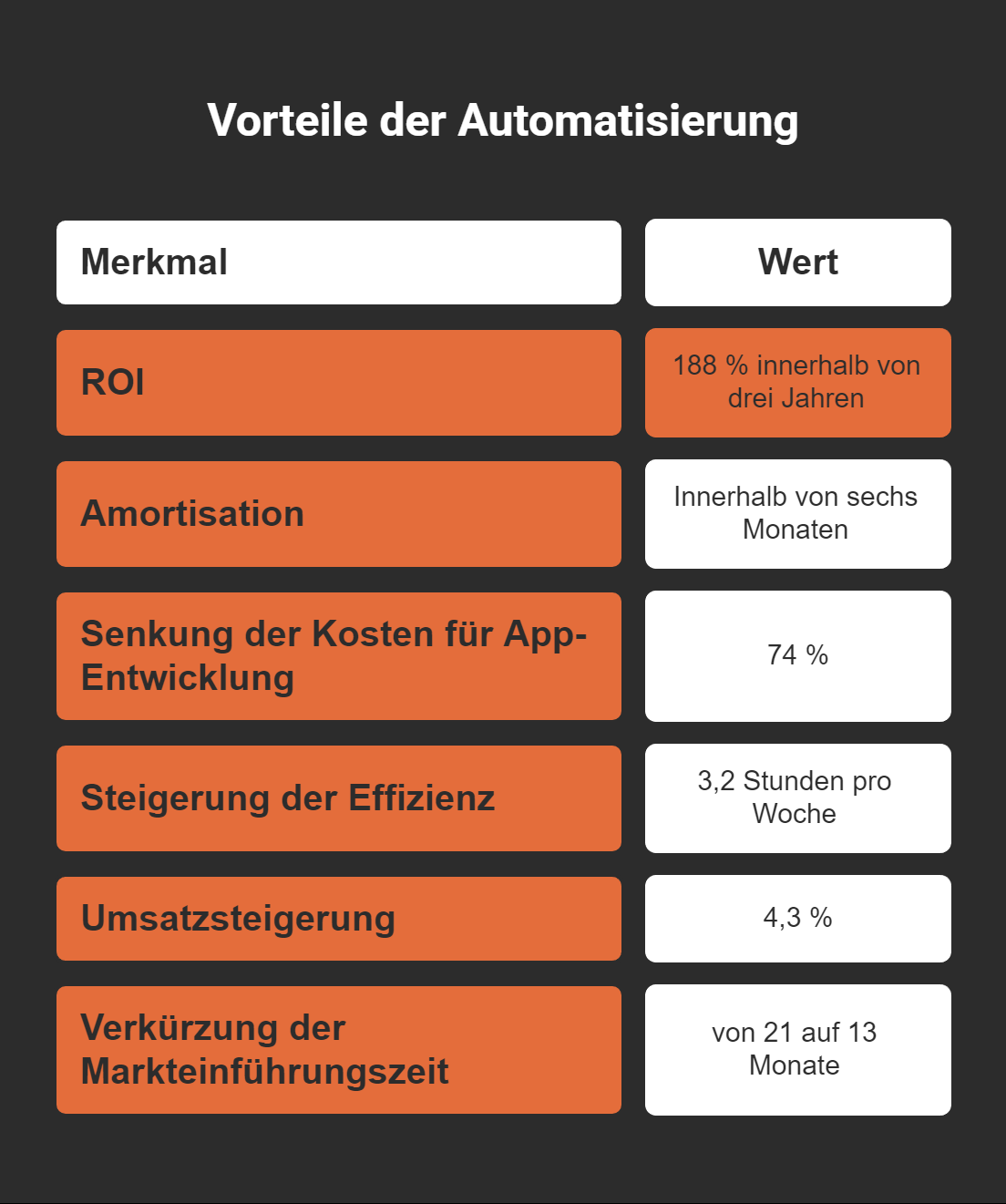 Die Automatisierung durch die Power Platform steigert nicht nur die Effizienz, sondern senkt auch die Kosten. Studien zeigen, dass Unternehmen die Kosten für die Anwendungsentwicklung um 45 % senken können. Gleichzeitig erzielen sie eine Rendite von bis zu 140 %. Diese Vorteile machen die Plattform zu einem unverzichtbaren Werkzeug für die Prozessoptimierung.