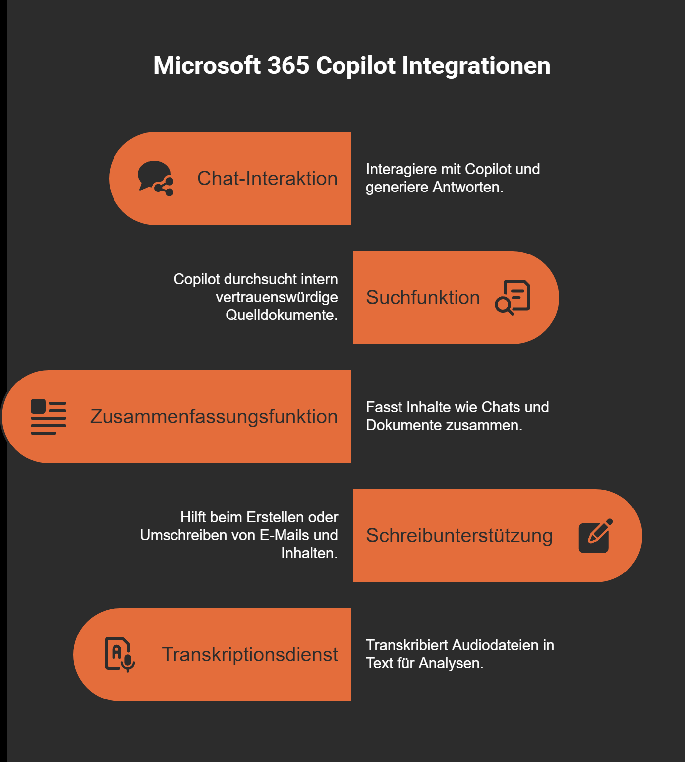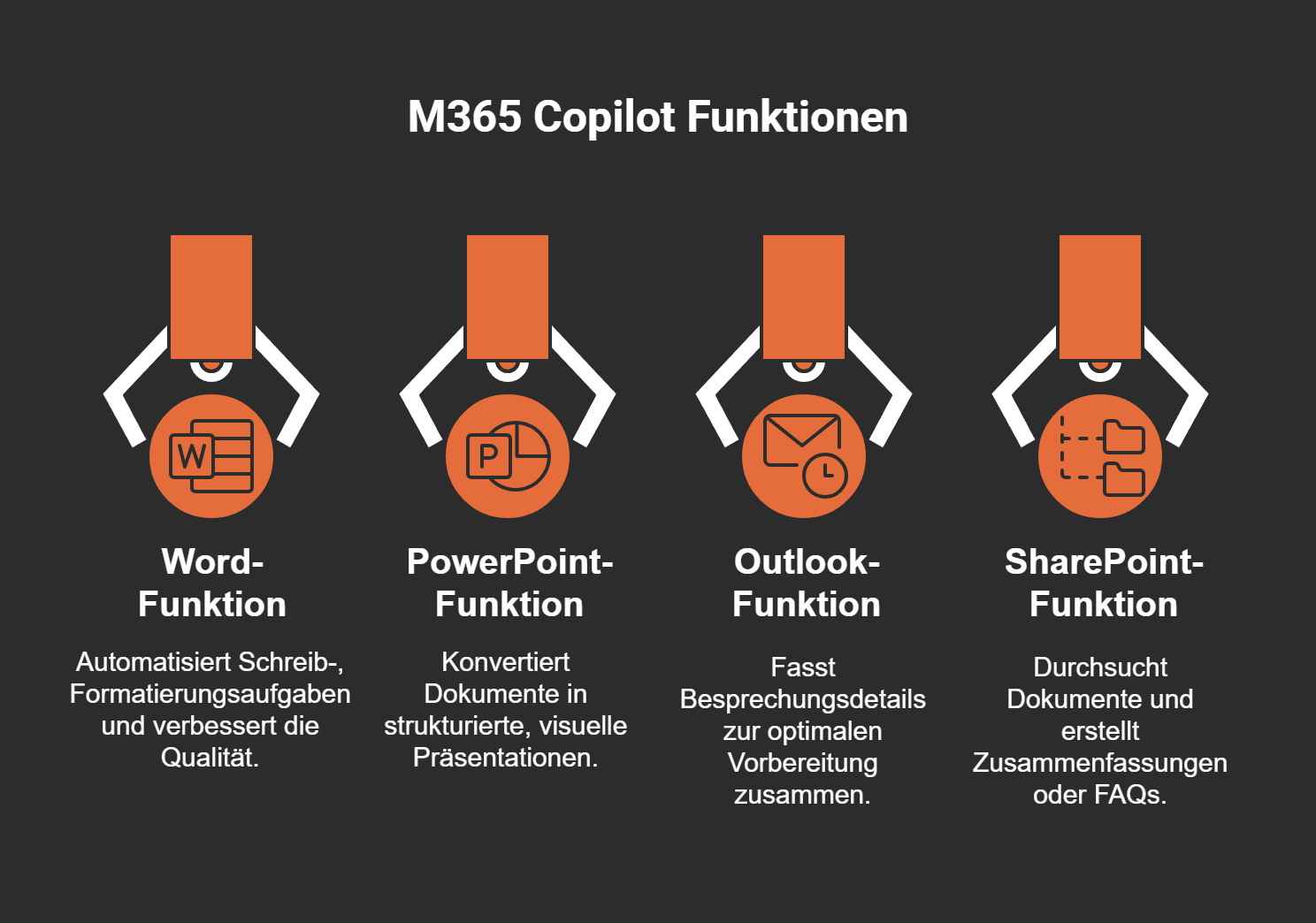 M365 Copilot ist in Microsoft 365-Tools wie Word, Excel, PowerPoint, Teams und Outlook integriert. Es bietet Funktionen wie Textüberarbeitung, Datenanalyse, Präsentationserstellung und Meeting-Protokollierung. Diese Integration macht es zu einem vielseitigen Assistenten für deinen Arbeitsalltag.