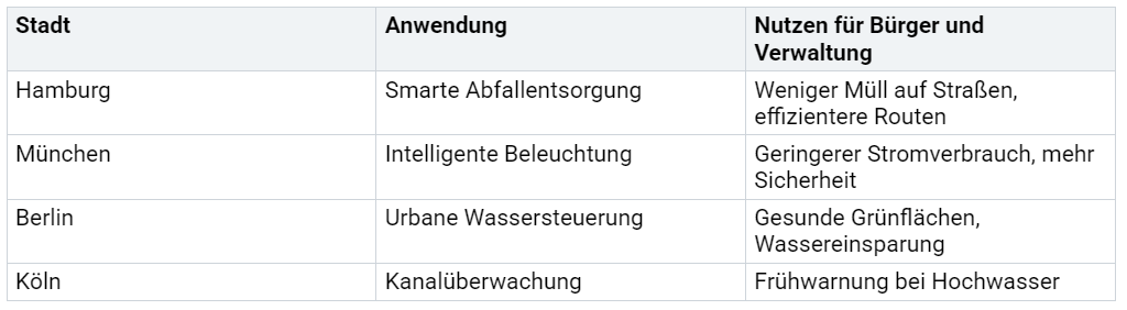Auch andere Städte setzen auf vernetzte Sensorik, um ihre Infrastruktur zu verbessern. In Hamburg melden Sensoren in Müllcontainern den Füllstand. Die Müllabfuhr plant ihre Routen effizienter und spart Kraftstoff. In München steuern intelligente Straßenlaternen das Licht je nach Verkehrsaufkommen. Das senkt den Energieverbrauch und erhöht die Sicherheit.