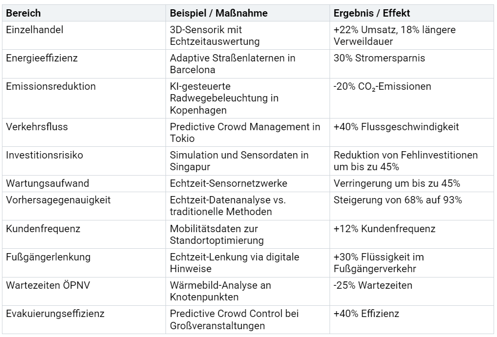 Vernetzte Sensorik steigert die Effizienz in Städten deutlich. Sensoren liefern Daten in Echtzeit. Verwaltung und Unternehmen treffen dadurch schnellere und bessere Entscheidungen. Adaptive Straßenlaternen in Barcelona sparen 30 % Strom. Predictive Crowd Management in Tokio erhöht die Flussgeschwindigkeit um 40 %. Einzelhändler nutzen 3D-Sensorik und steigern den Umsatz um 22 %. Echtzeit-Sensornetzwerke senken den Wartungsaufwand um bis zu 45 %.