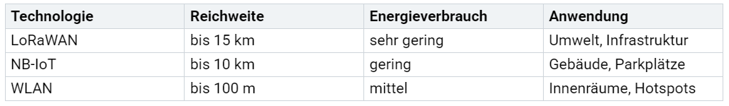 Die Vernetzung verbindet die Sensoren mit der digitalen Infrastruktur der Stadt. Sensoren senden ihre Daten über Funktechnologien wie LoRaWAN, NB-IoT oder WLAN an sogenannte Gateways. Gateways sammeln die Daten und leiten sie an zentrale Cloud-Server weiter.