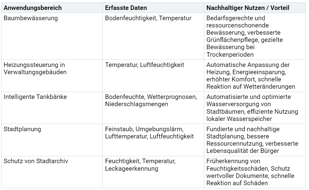 Sensorik unterstützt nachhaltige Stadtentwicklung. Sie misst Bodenfeuchtigkeit, Temperatur und Luftqualität. Die Stadt kann Grünflächen gezielt bewässern und Ressourcen schonen. Heizungen in Verwaltungsgebäuden passen sich automatisch an das Wetter an. Intelligente Tankbänke versorgen Stadtbäume effizient mit Wasser. Die folgende Tabelle zeigt, wie verschiedene Anwendungen zur Nachhaltigkeit beitragen: