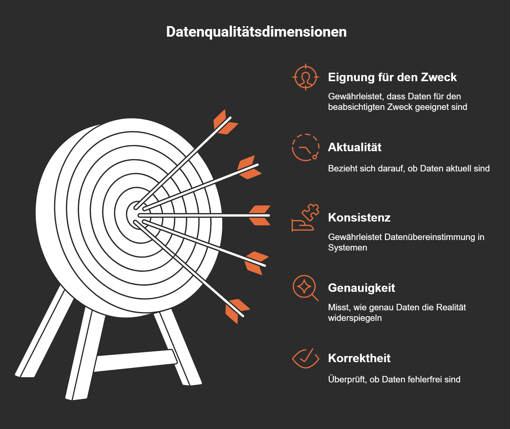 Genauigkeit: Daten müssen die Realität präzise widerspiegeln. Fehlerhafte oder ungenaue Daten können zu falschen Schlussfolgerungen führen.