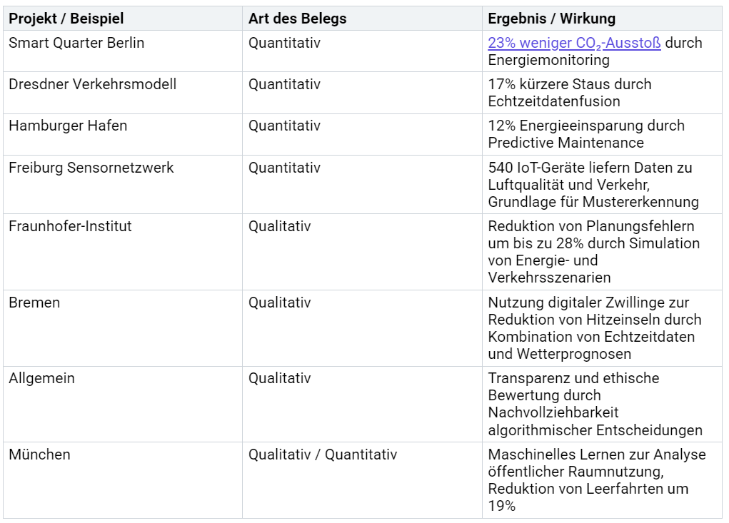 Diese Beispiele zeigen, dass digitale Zwillinge in Smart Cities sowohl messbare Verbesserungen als auch qualitative Vorteile bringen. Sie senken Emissionen, verkürzen Staus und sparen Energie. Gleichzeitig erhöhen sie die Transparenz und verbessern die Planung.